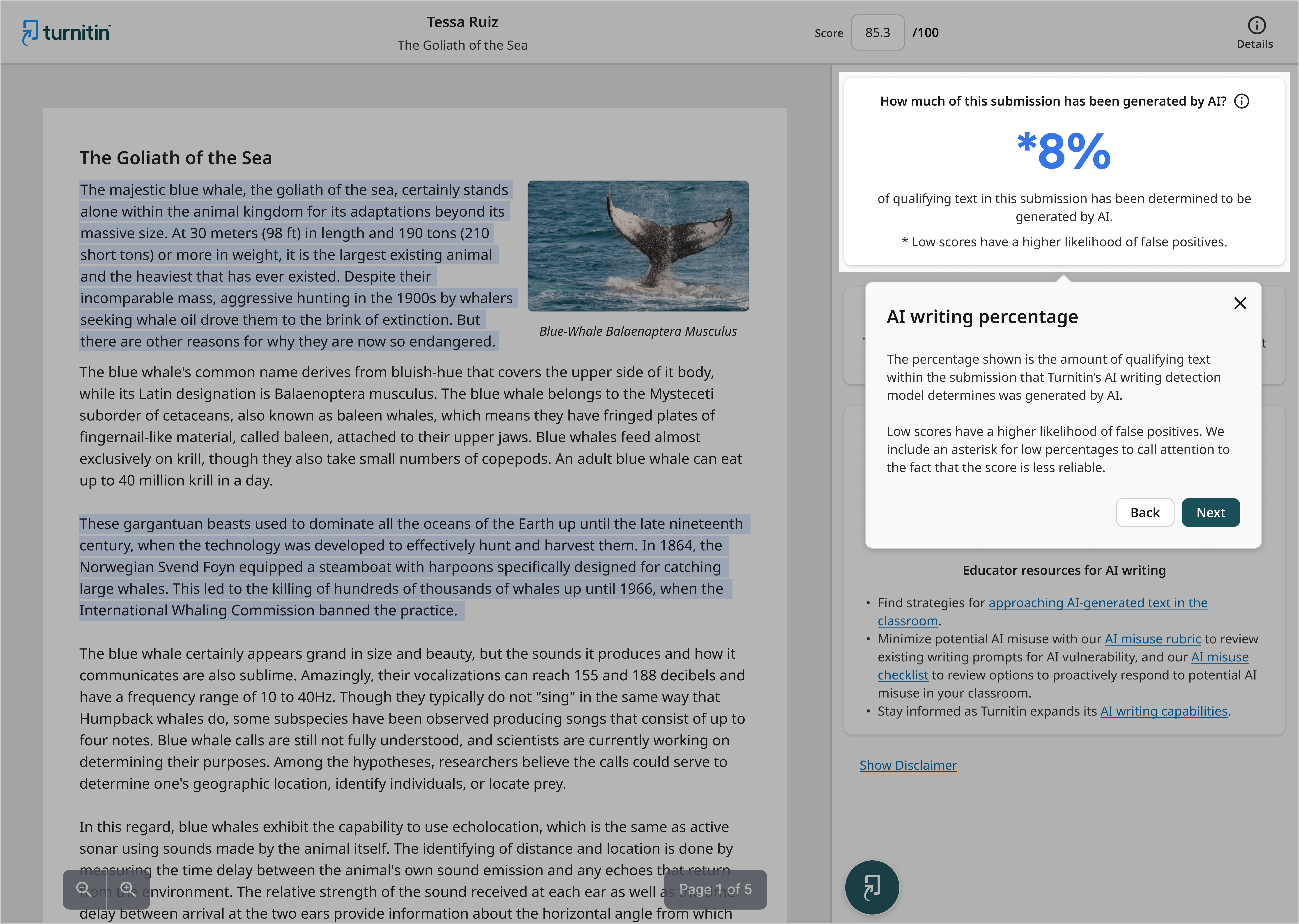 We considered several indicator treatments for this scenario, including not showing a percentage score when we detect less than 20%, but educator feedback was consistent: they did not like the idea of hidden AI percentage scores because it takes away their opportunity to have more information and to exercise academic judgment.