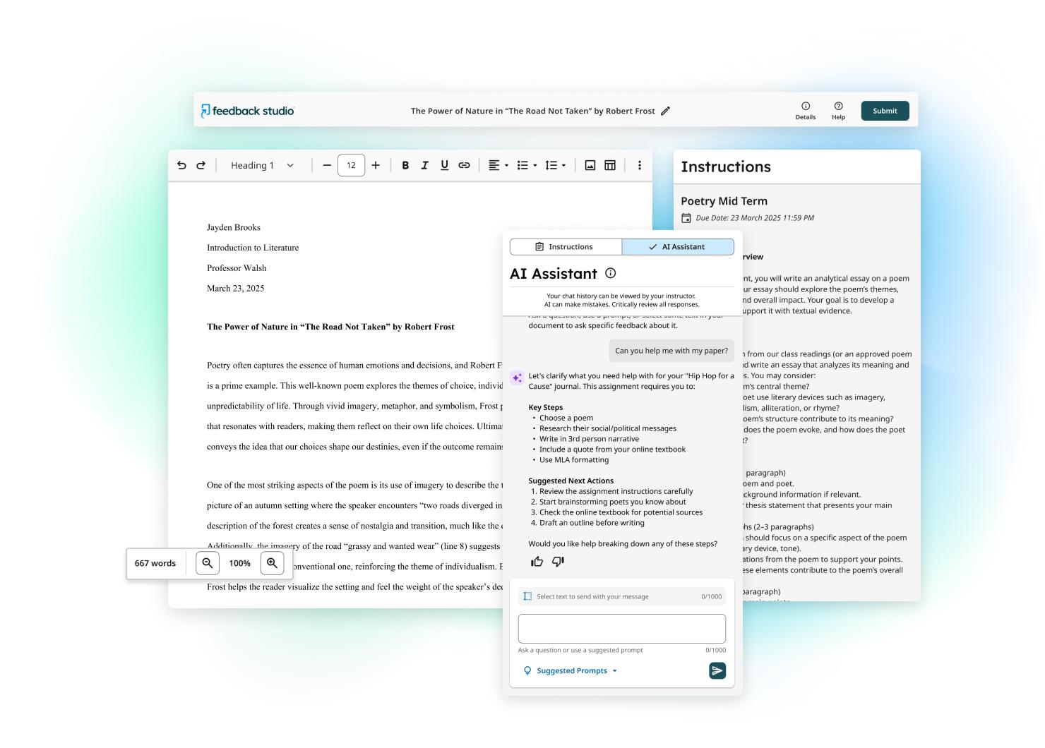 From accessing assignment instructions to drafting, editing, and refining their work over multiple sessions, students can confidently navigate the writing process all within the same learning management system.