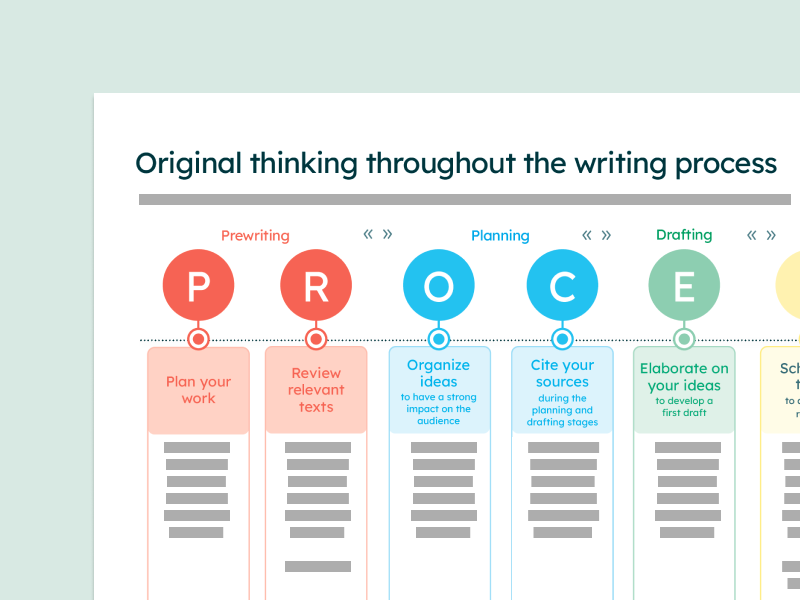 A visual reminder within the classroom, this poster's focus on the writing process suggests different methods or tools to accomplish writing goals. In addition, if a question about AI misuse in completing an assignment arises, the process creates clear documentation of the process which can be used during a conference. This resource may be paired with the Ethical AI use checklist for students or the Original thinking is a process handout.