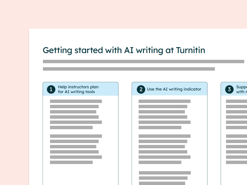 This one page guide suggests a pathway for administrators who may need some guidance in helping instructors prepare writing assignments in the age of AI and in using Turnitin's AI writing detection capabilities. The guide focuses on helping instructors plan for AI, learning how to use Turnitin's AI writing detection capabilities, and then providing additional resources for continued support.