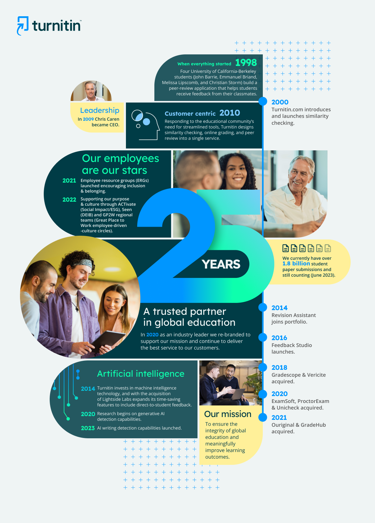 Oakland, Calif. – June 12, 2023 - Today, Turnitin celebrates its 25th anniversary, commemorating a quarter of a century in edtech innovation. While times have evolved greatly since the company’s inception, Turnitin continues to support educators and students with a portfolio of innovative products that address real world challenges in the classroom.