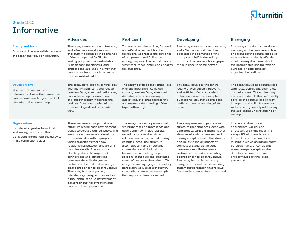 Consider using the 9th-12th Grade Informative QuickMark set with this rubric. These drag-and-drop comments were tailor-made by veteran educators to give actionable, formative feedback directly to students. While they were explicitly aligned to this particular rubric, you can edit or add your own content to any QuickMark.