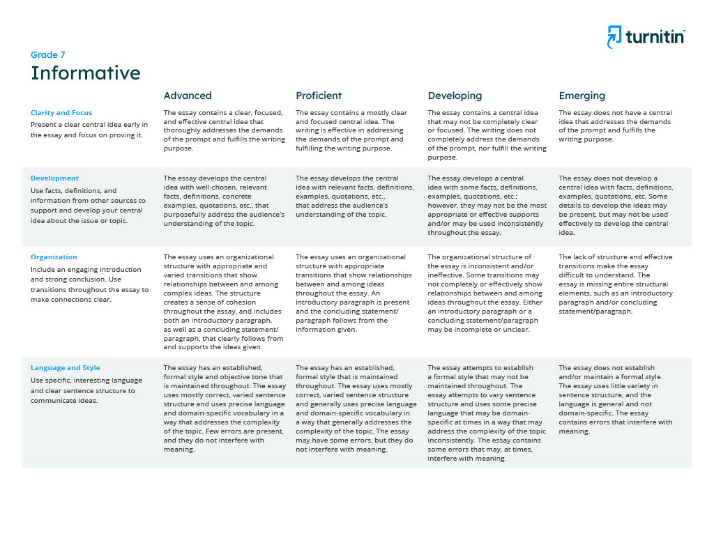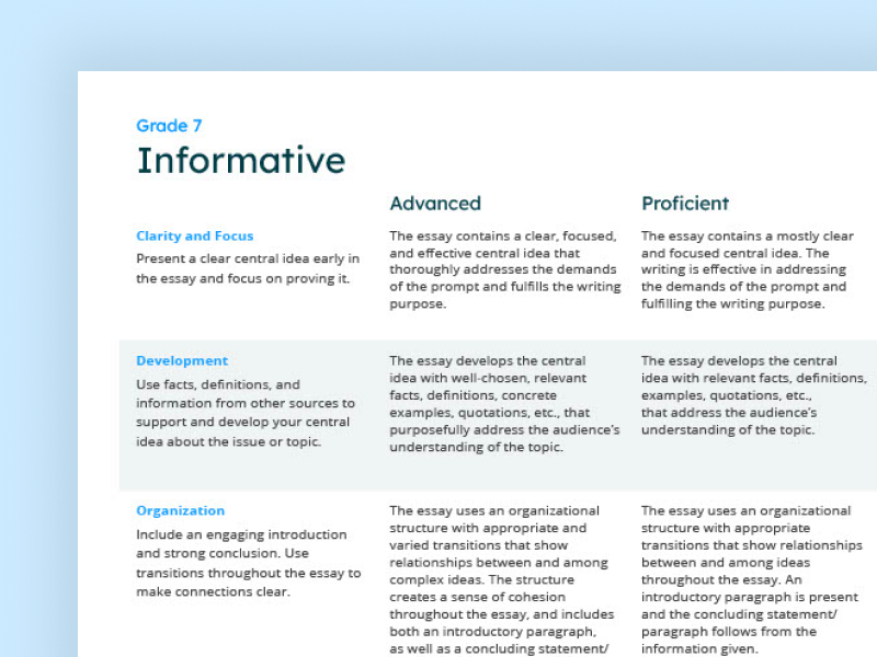 Offer 7th-grade students a standards-aligned structure for informative writing with this educator-developed rubric for Feedback Studio.