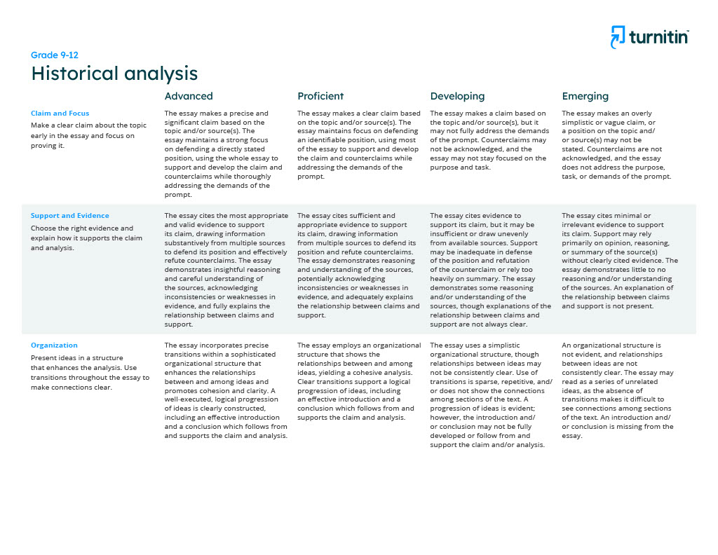 Consider using the 9th-12th grade historical analysis QuickMark set with this rubric. These drag-and-drop comments were tailor-made by veteran educators to give actionable, formative feedback directly to students. While they were explicitly aligned to this particular rubric, you can edit or add your own content to any QuickMark.